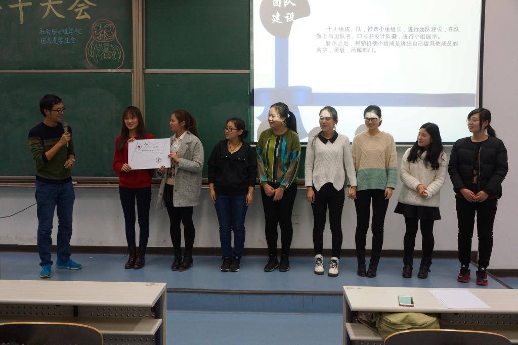 随后,全体院会成员分为5队,每队设计自己的队名、口号、队徽。带着表演时搞笑的余劲,各队的设计都剑走偏锋,有的主打男女比1:8特色,有的大力弘扬团结友爱的主旋律,还有的直接将全体队员的名字组成队名,考验了主持人的肺活量。短短的展示也成为干事们表演的舞台。