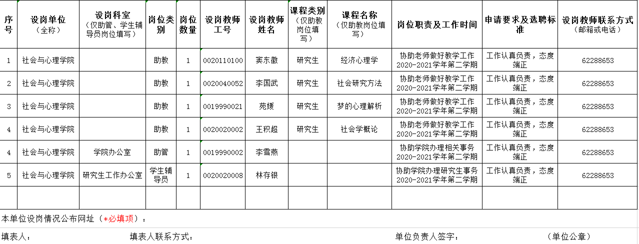 1.2021年3月8日17:00前,设岗单位(含公司和职能部门)根据岗位名额将本表电子版和签字盖章的扫描件提交至研究生奖助工作办公室备案(邮箱:cufeyjsjzb@163.com)。各设岗单位需同步将设岗情况(含本表内除设岗教师工号外的所有信息)在本单位网站公开发布,研究生工作部将汇总网址链接进行统一公布。