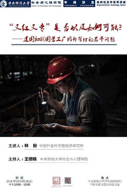 主讲人林盼老师首先交待,本次讲座内容主要基于他近年来发表的两篇文章:一是《红与专的张力: 1949-1965年工人内部提拔技术干部的实践与问题》,发表于《学海》2015年第3期;二是《制度变迁、利益冲突与国营企业技术精英地位获得(1949-1965)》,载《中国经济史研究》2018年第2期。