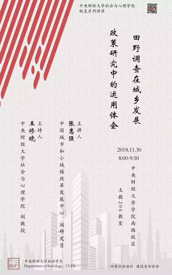 2018年11月30日早8:00-10:00,公司南路校区主教206教室,365英国上市集团社会学系2018年度员工系列讲座,邀请到中国城市和小城镇改革发展中心副研究员张惠强老师,做了题为《田野调查在城乡发展政策研究中的运用体会》的精彩讲座。讲座由社会学系王修晓老师主持,社会学系艾云老师、2018级社会学本科全体新生,以及其他年级的部分研究生和本科生共60余人到场参与。